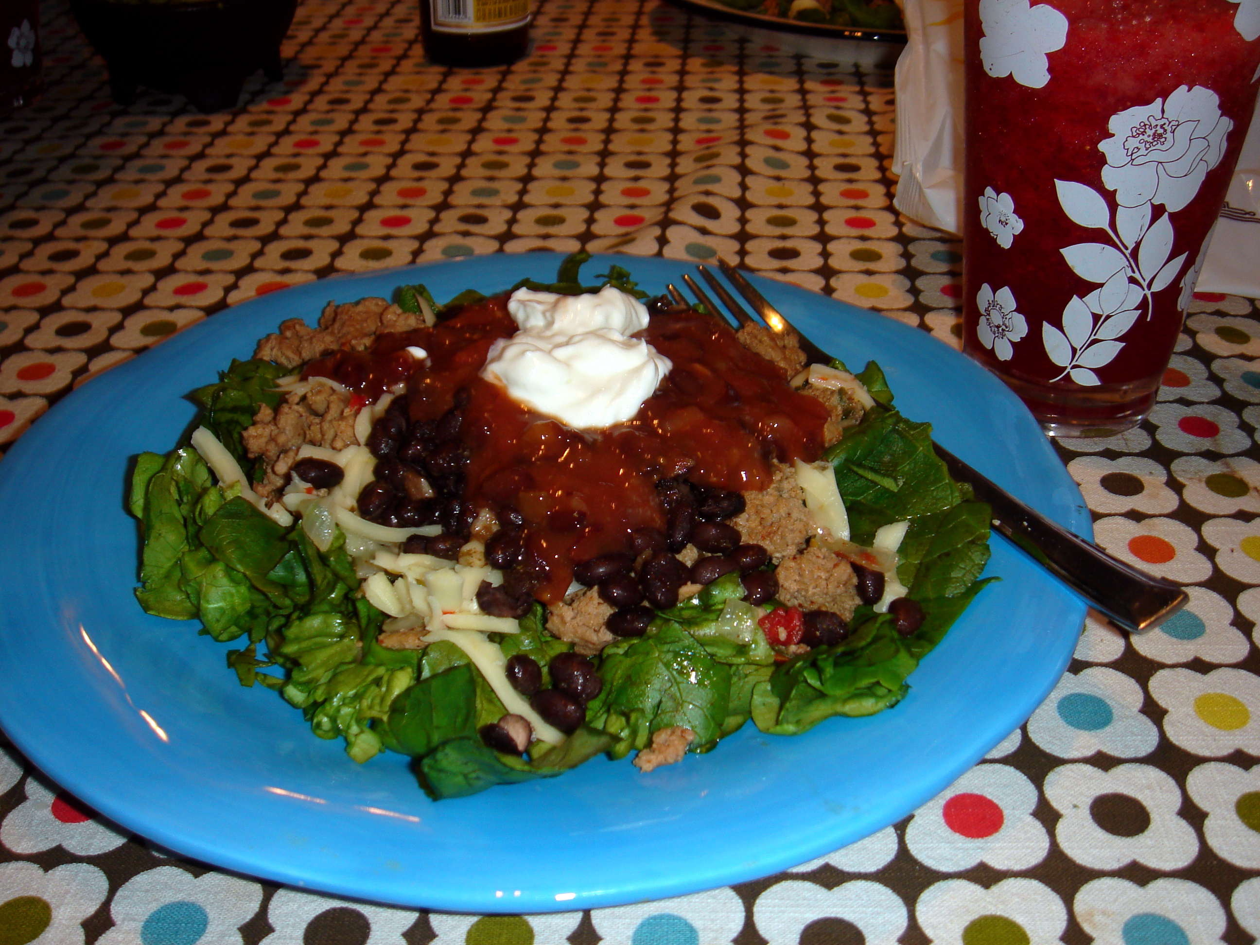 For dinner, I decided to make us a Mexican-flavored feast. At first I thought of making some sort of taco/burrito thing, but using lettuce instead of shells or tortillas. Eventually I decided to just do a taco salad. I picked up some organic, certified-humane, free-range ground turkey (you guys, I really wanted beef, but I can’t often afford beef that fits my food values), and I sauteed it with some of the onions, garlic, cumin, chili powder, fajita seasoning, and half a can of Ro-Tel. While that was going in the skillet, in another skillet, I sauteed some garlic and then added a can of black beans, cumin, and salt. Jon sliced up the other lettuce and gave it a whirl in the salad spinner while I shredded pepper jack cheese. We made a bed of lettuce on our plates, topped it with the turkey and beans, sprinkled some pepper jack cheese on top, and topped the salads with salsa and a dollop of Greek yogurt, which I buy because it’s fat free, and yet way more flavorful than fat free sour cream, and thanks to the live and active cultures, it doesn’t go bad as fast as sour cream.