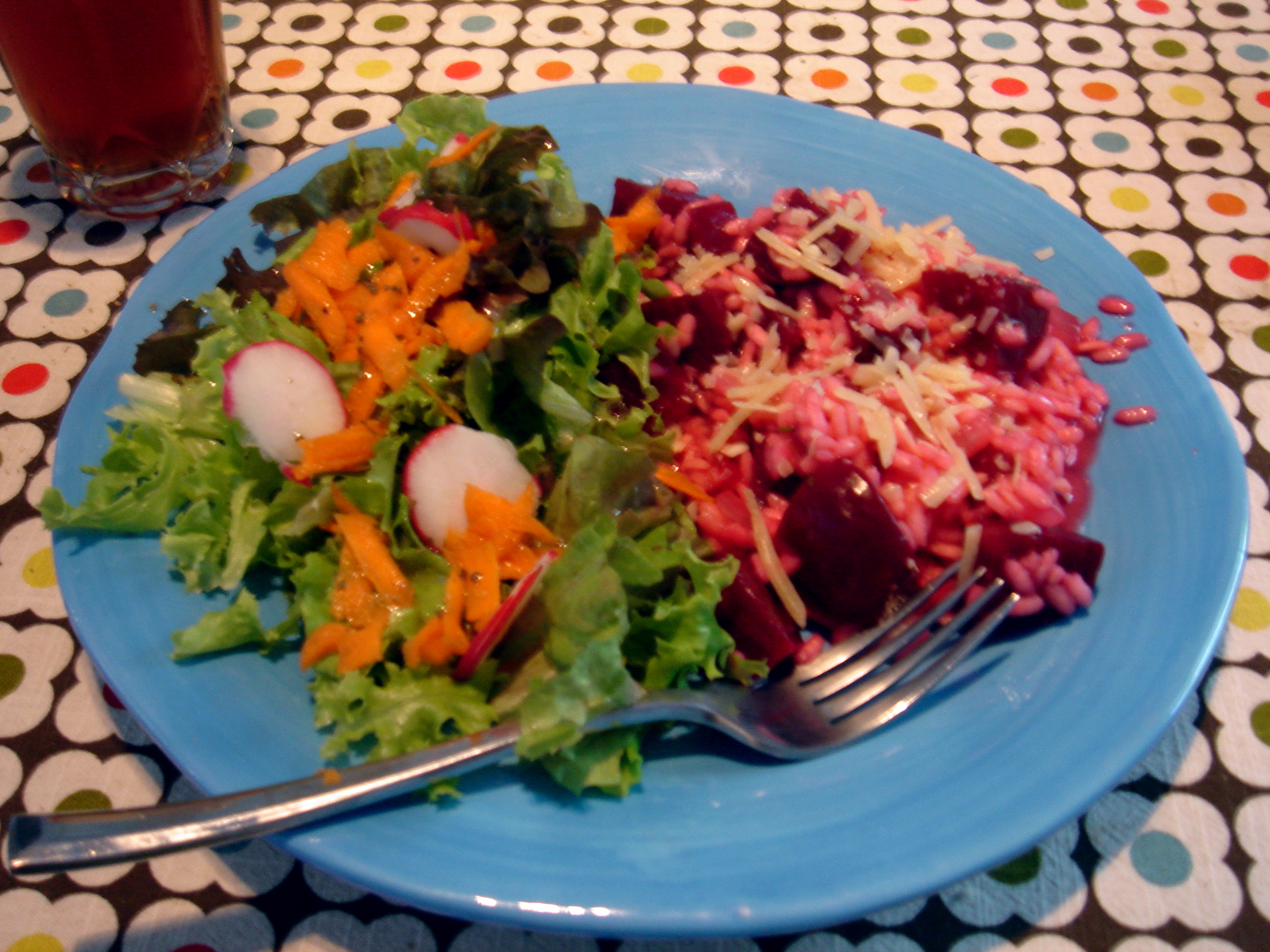 Wednesday I used the beets I had roasted Tuesday night to make Roasted Beet Risotto.  After reading the recipe’s reviews, I made a few changes, adding garlic and sauteeing my garlic and onions in butter instead of oil, adding some rosemary, using more salt and pepper.  It turned out pretty good, and though I’m not a huge beet fan, I’m glad to have found one way I like eating beets.  We ate our risotto with a side salad featuring the lettuce, radishes, and some carrots with an oil and white wine vinegar dressing.