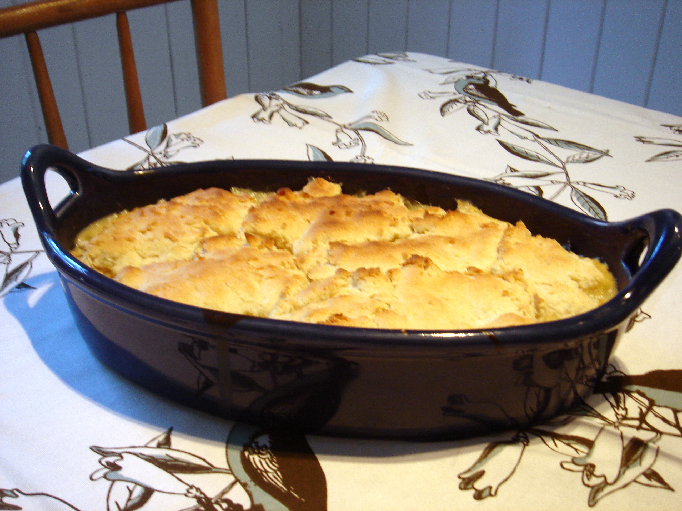 Instead of rolling out the dough and cutting it, I just patted it flat with my fingers and placed it on top of the pot pies. Way easier than hauling out a food processor to make a normal pie dough.  And the final result was very tasty.