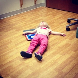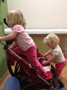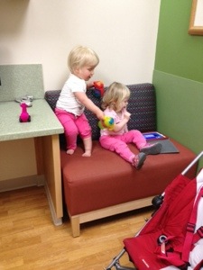Spina Bifida clinic is always like this– they try to line up 3-5 services to see patients all in one day, and this leads to a lot of waiting for one or the other to get out of an OR or out of another patient’s room to see you. All day clinic visits were rough with infants, but they are just essentially impossible with toddlers. I was well-prepared with snacks, toys, iPhone and iPad, and even a movie, but by about hour two we were losing it. I even got both girls strapped into the stroller and told the clinic coordinator we were leaving, which prompted her to kindly give us some snacks and swear that the orthopedist was definitely actually on his way for real this time, no kidding. These long days make sense for people who come from all over the state to the clinic and don’t want to drive to Little Rock for multiple services. But for someone like me, who doesn’t always have childcare and lives about 3 miles from the hospital, it doesn’t make sense. From now on, I’ll be making appointments to see only one service at a time. No more trying to corral my little ones in a tiny room for hours on end.