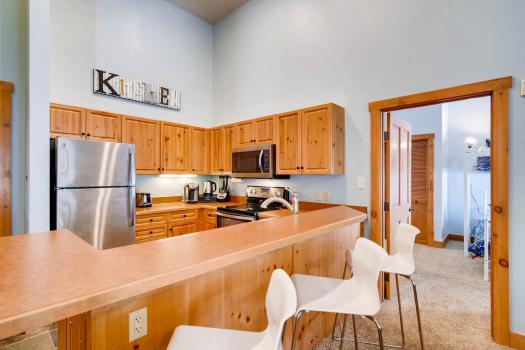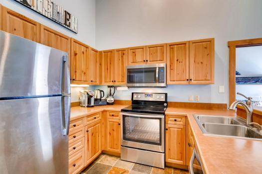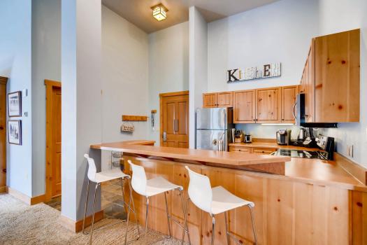 We wanted to find a narrow dining table so as not to block balcony access. We ended up making this one out of an Ikea countertop. Chairs from AllModern, pillows in nook from Target, light fixture from Wayfair. I put pillows in the skylight nook and think it’ll be a fun place to relax, read, and watch the snow fall.Summer is when EVERYONE is updating their units in Summit County, so we couldn’t get new countertops yet. The kitchen does feature brand new appliances, and I made sure it has everything a cook could need.
