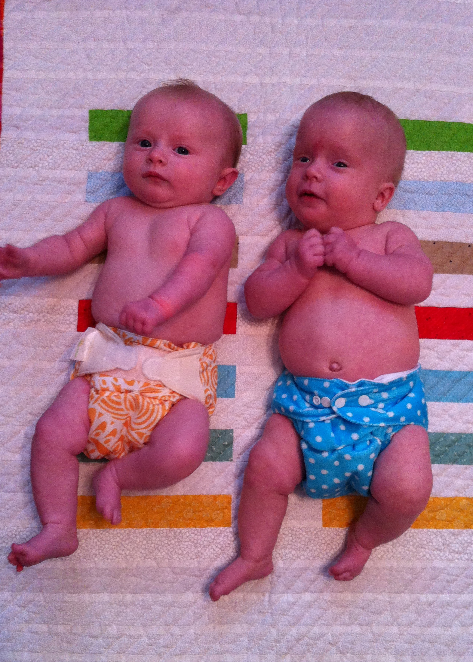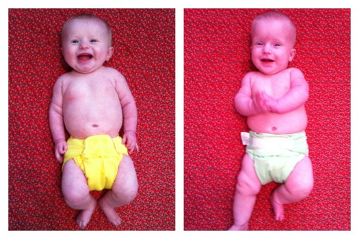 My initial post on cloth diapering our girls has been so popular, I thought I’d write a follow-up now that we’re 5 months in, as I wrote the original only a week or so after we moved into our one-size diapers. So, see that post for the most detailed newborn cloth diapering info, and this one for cloth diapering past the newborn stage.