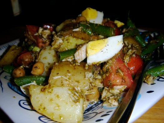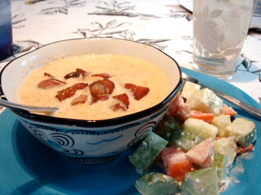 Today, stomach growling, I peeked in the fridge and realized that while I had ingredients to make two more dinners (I shop the Farmer’s Market on Saturdays and fill in with the grocery store on Sundays), the only other things I had to eat were bacon, eggs, tortillas, cheese, pita chips, and hummus. I had completely forgotten to plan for lunch, because I got so used to having leftovers or something from the freezer! “What are we going to EAT?” I wailed to Jon, flopping down on the guest bed near where he was using his computer. (I tend to get swoony and dramatic when hungry.) “We could get some lunchmeat and sandwich stuff,” he suggested. “But that’s against the rules!”