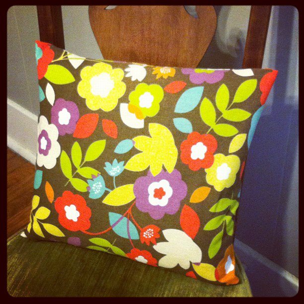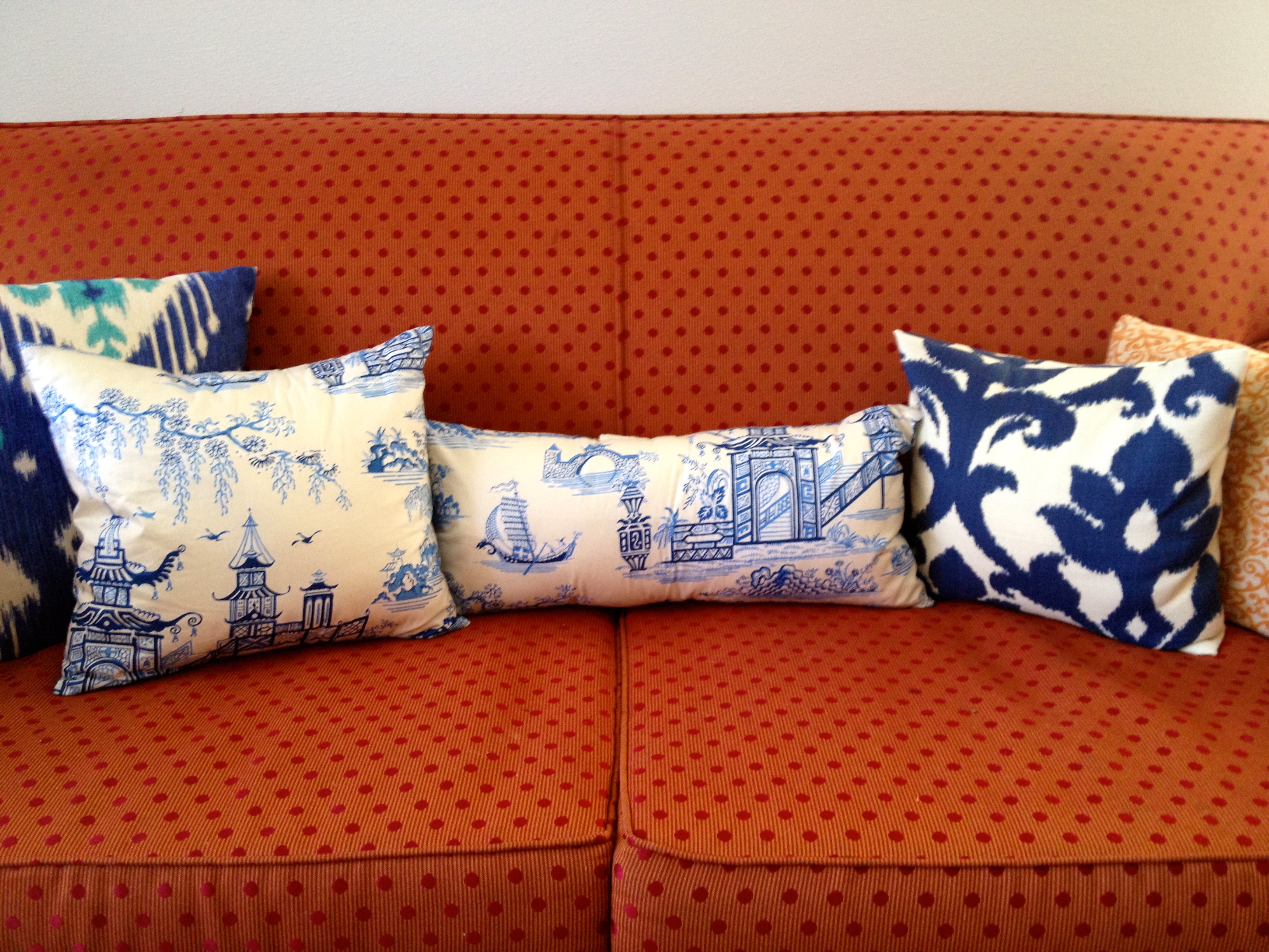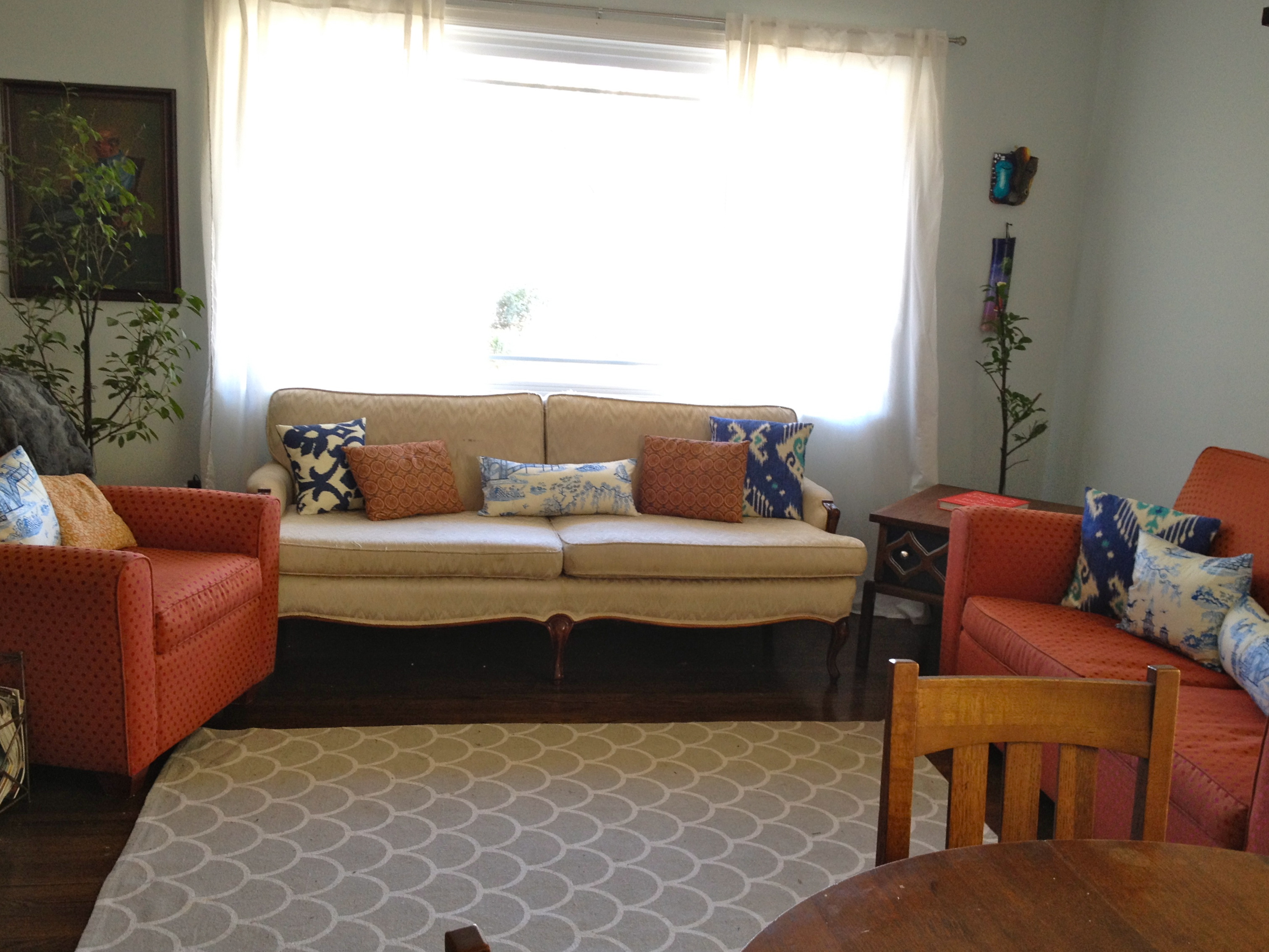 To go on the futon, I made 4 throw pillow covers with fabric I happened to already have in my stash, that I think goes well with the rug: