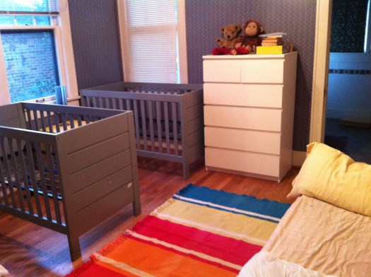 The cribs are actually the only “new” thing in the photo, and they’re BabyMod from Walmart. Cribs were a tough decision for me, because I originally really wanted bright red cribs, which apparently do not exist. Then I thought I’d paint unpainted cribs, which also do not exist, unless I want to pay a zillion dollars or drive 4 hours to the nearest IKEA, which, it turns out, didn’t have the unpainted ones in stock anyway. So we ended up with gray cribs that actually blend surprisingly well with the aforementioned wallpaper. The dresser we already had, and there are three smaller nightstands in the room that we also already had. Even the rug was something we already had.