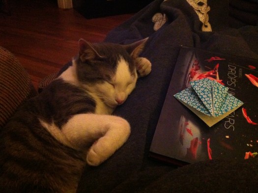 A lot of evenings were spent in the recliner with Tinycat folding cranes. He wasn't very helpful, but he sure is snuggly!I folded enough cranes to fill this bag, then got started and realized I needed about 50 more. This is why it's helpful to have more paper than you use, so if you fold more, they'll still match the rest of the group.Then, hot-glue the cranes to your lamp all haphazard like.