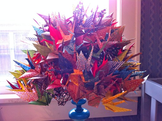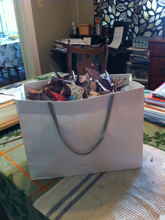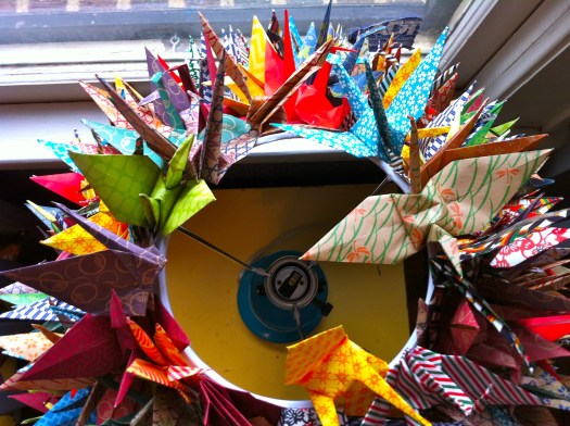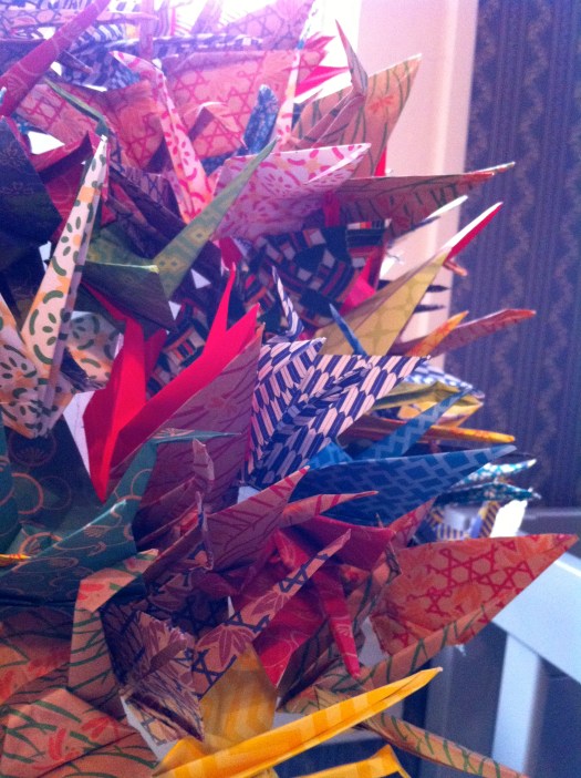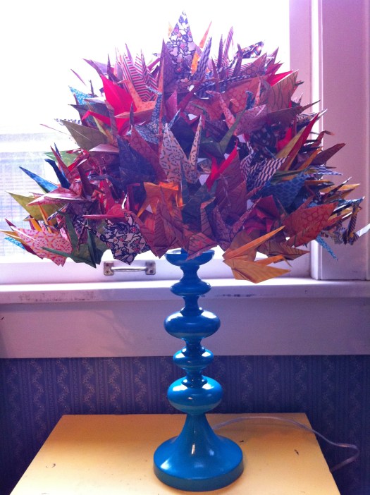First: you need a LOT of origami cranes. Obviously this varies depending on lampshade size, but I’d say at least 200, maybe more. (If you don’t know how to fold a crane, I highly recommend YouTube. It’s so much easier when you can watch someone’s hands actually folding instead of trying to decipher diagrams.)