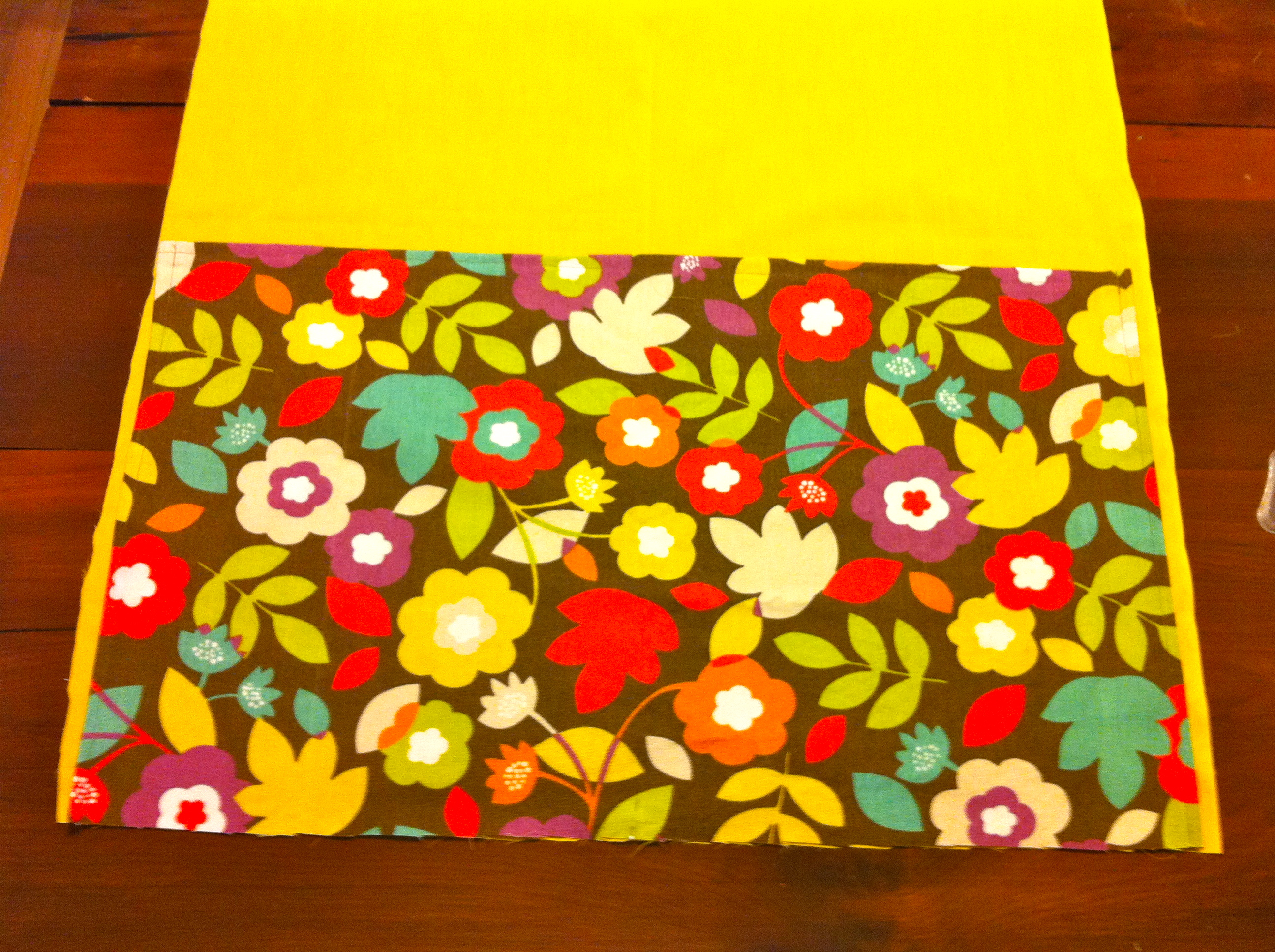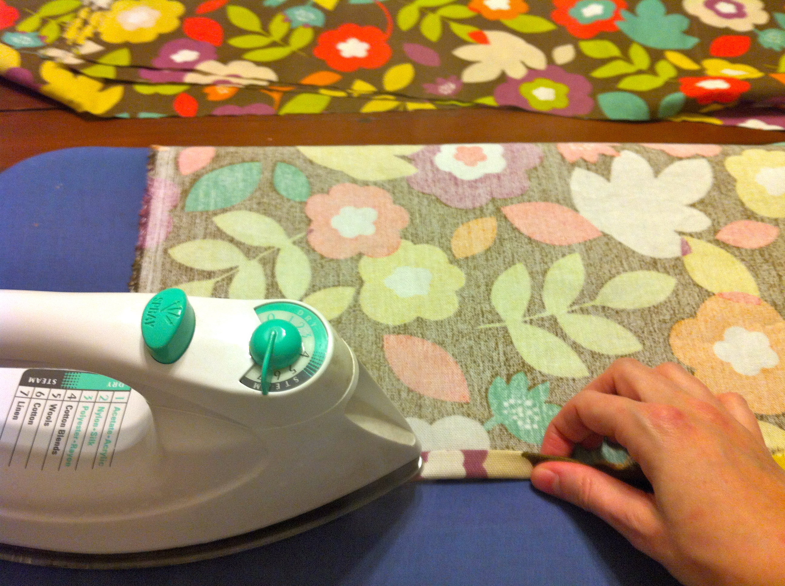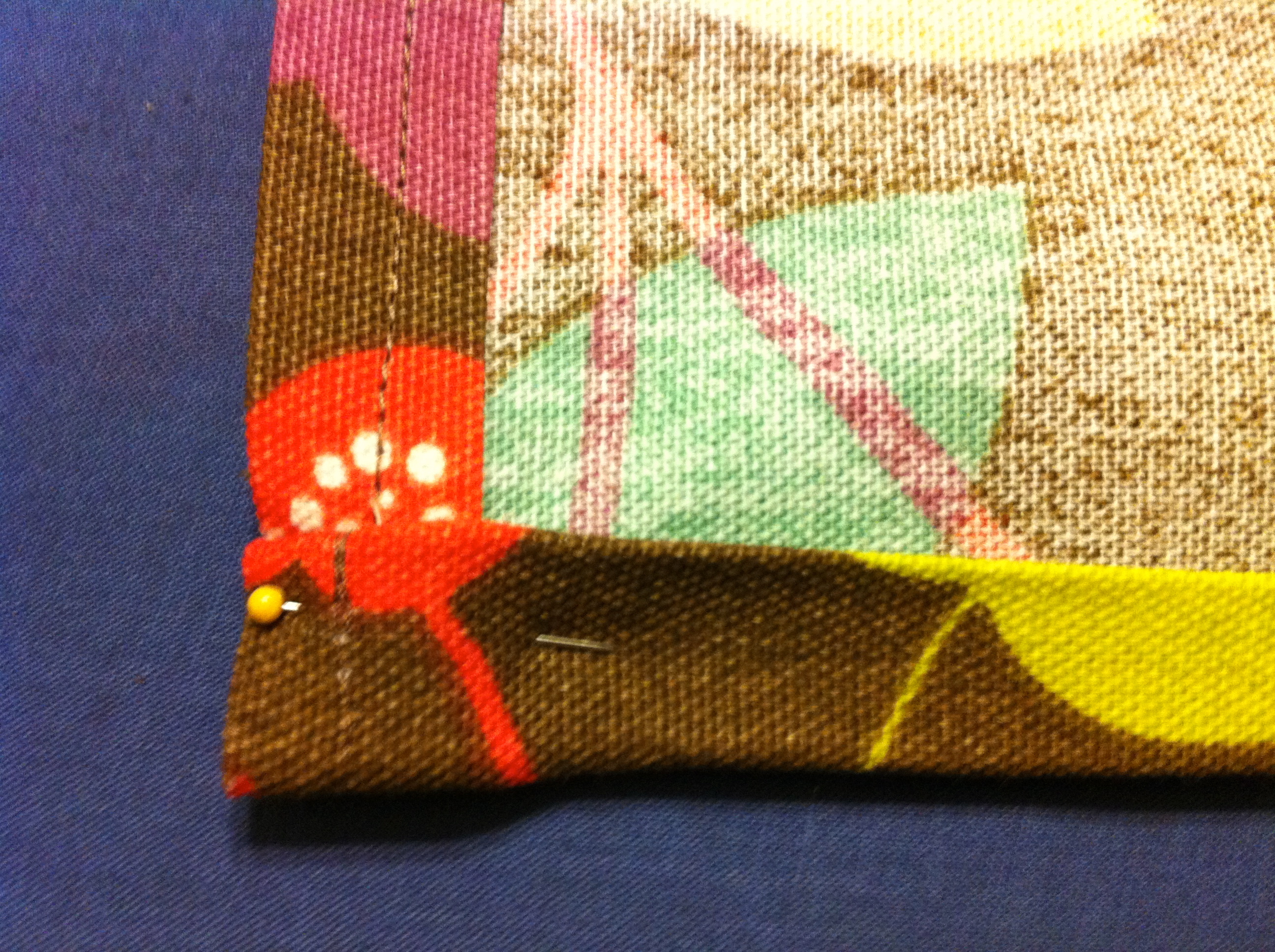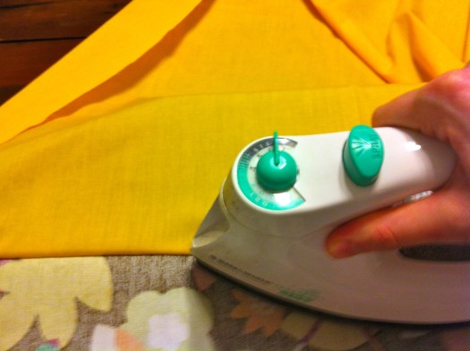 Create a similar hem on the two short sides of each skirt panel by folding and pressing 1/2″, folding that up and pressing again, and sewing close to the inner edge of the folded portion. It may help to pin the corners where the fabric is bulky because of the bottom hem: