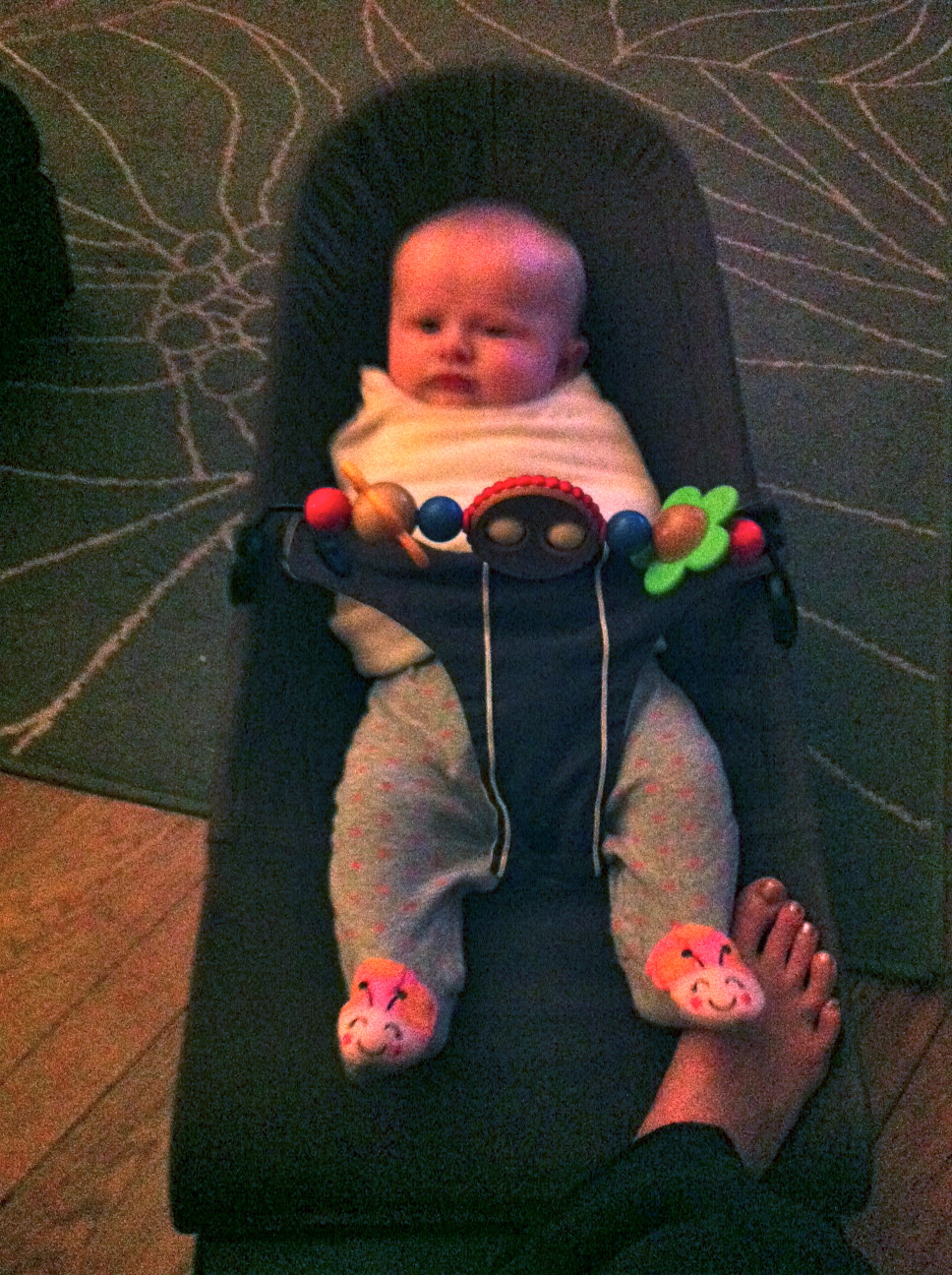 We’ve been having a rough time with fussy Etta lately. When she is happy, she is very very happy, but when she is bad, she is horrid. After a few nights in a row, I was looking for solutions. She loves to be bounced, HARD, in her bouncy seat. And she loves to be swaddled tightly. But those two things can’t be combined very easily, because the swaddle gets in the way of the seat’s straps.
