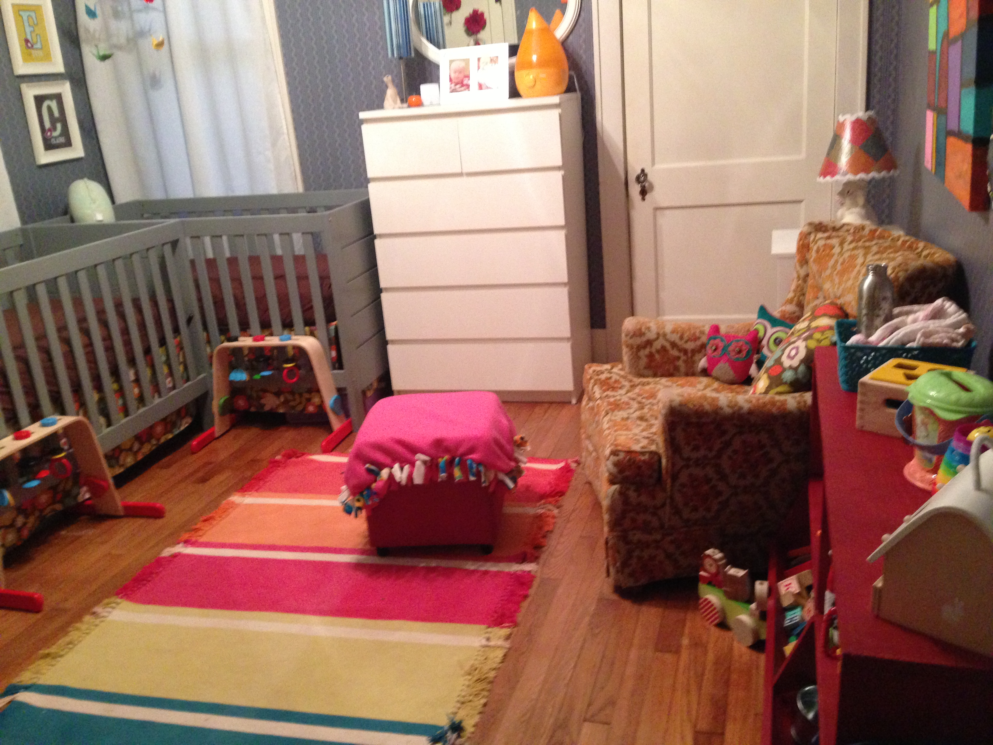 Overall, the girls have the best-decorated room in our house, and we still haven’t bought a single new piece of furniture beyond the cribs, which were a gift from their grandparents. As I type, the girls are playing in the floor and I’m sitting in the chair.