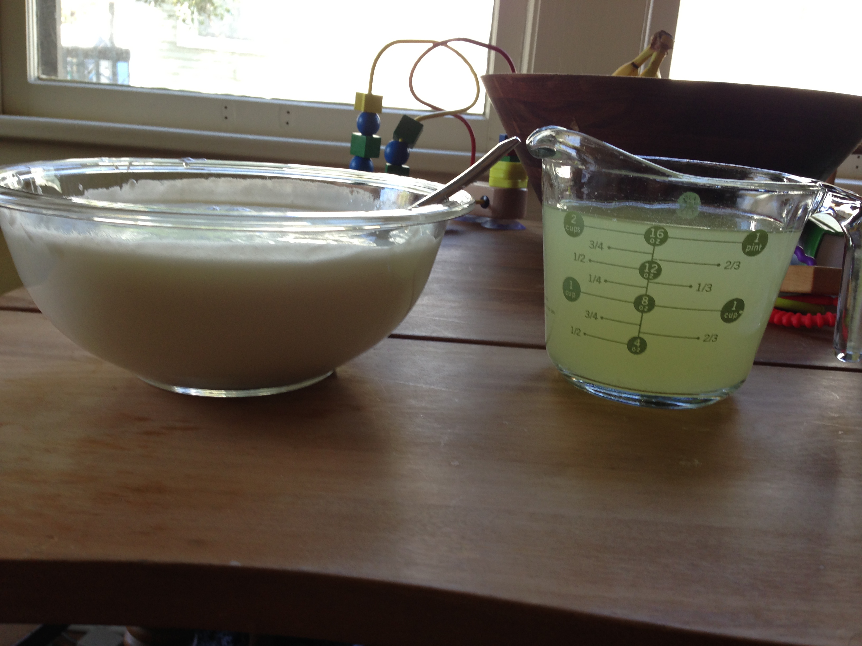 I leave the Pyrex in the oven with the light on overnight, for about 12 hours. In the morning, when I wake up, I go in, take off the lid, and it’s yogurt. Well, yogurt swimming in whey. So, I line a colander with either a couple layers of cheesecloth or a thin dishtowel like a flour sack towel, and set it in a bowl (you could just do the sink, but I’m saving the whey because I’m crazy and want to try making whey ricotta cheese), and strain the yogurt until it’s nice and thick and creamy. Half a gallon of milk left overnight yields 1.5 quarts of yogurt and 2 cups of whey. Scraping it off the towel with a spatula is really as tough as the work gets here.