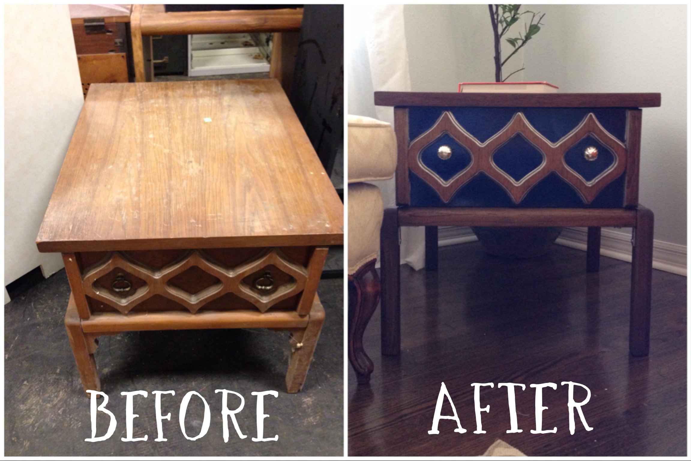 Another recent project, designed by me and executed entirely by my husband, was the remake of a thrift store end table.