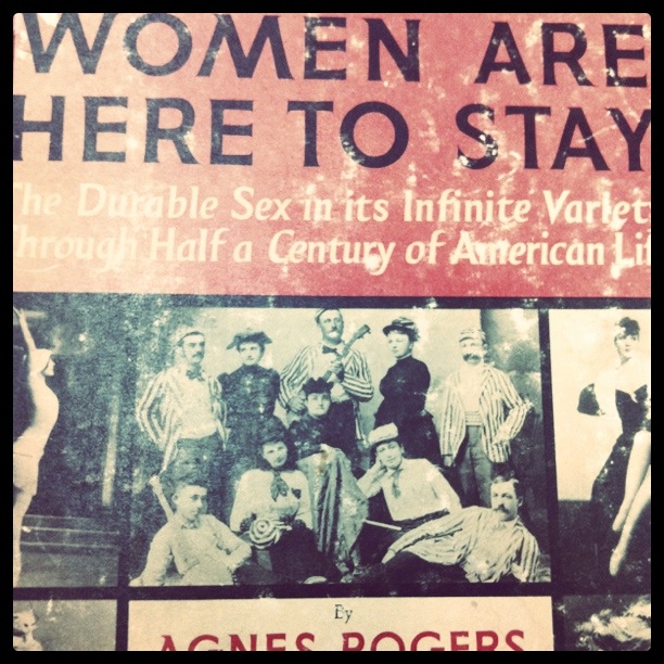I spend a lot of time hanging out in my university library between classes. Usually I’m busy looking over materials for class, or checking in with my internet world, but sometimes I let my eyes wander over the shelves wherever I’ve settled, just to see what catches my eye. Recently, a tall book caught my eye, its title visible over the tops of all the other books: Women are Here to Stay. “Of course we are!” I said to myself, “Where else could we go? Who could manage without us?” I pulled the book off the shelf and read the subtitle: “The Durable Sex in its Infinite Variety Through Half a Century of American Life.”