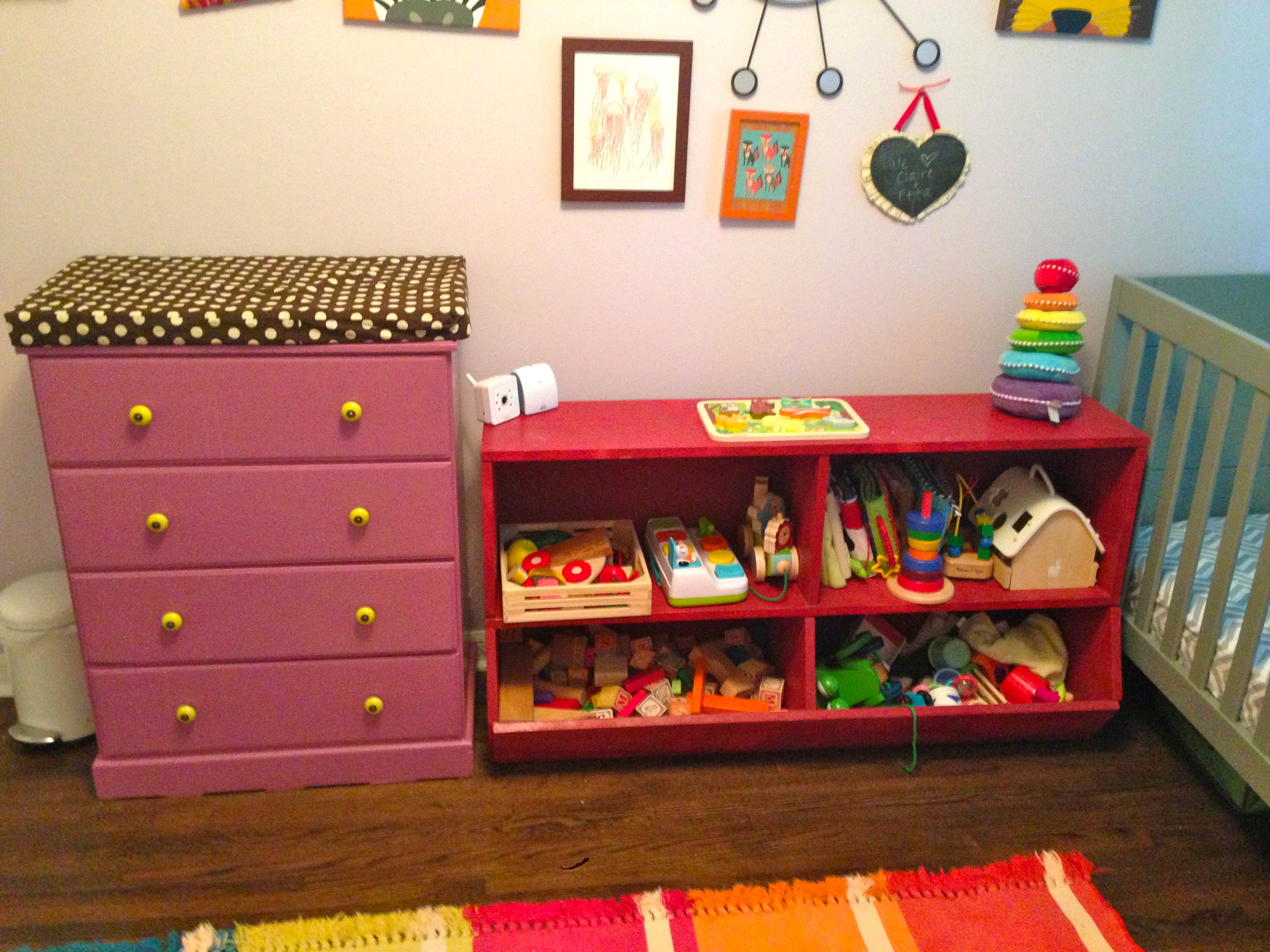 Here you see a prime example of my half-assed gallery wall methods. Some blogs will give you a tutorial for measuring and laying out a mathematically perfect gallery wall. I am not that girl. I just sort of eyeballed it. I think it turned out OK. The Vonnegut quote canvas is up a little high, but it has to be to keep little hands from grabbing at it when changing babies on the changing table.My husband built the toy shelf, and the changing table was a dresser found by the curb in our neighborhood.