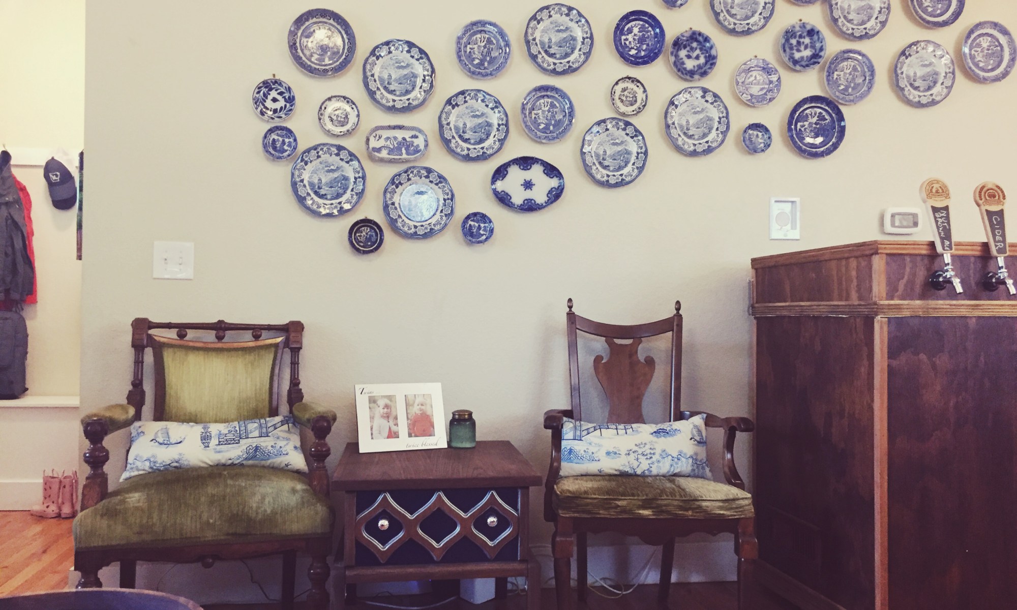 A few years ago, I inherited from my grandmother a collection of blue and white plates, some of which my grandfather had sent home from WWII to his mother. I have loved and treasured them in a cabinet for several years, but knew that the next time we owned a home, I wanted to decorate a room around displaying them. Well, we finally bought a house last summer, and all these months later, I’ve finally (mostly) finished our front/dining room.