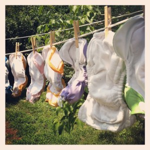 One thing to keep in mind with cloth diapers is not to use anything on them that might coat the fabrics or make them less absorbent. This means using “cloth diaper safe” detergents and diaper creams. Lots of folks use all kinds of specialty detergents, and there are lists that will let you know what’s safe, but I use Tide Ultra because it’s cheap, easy to find at Target, and gets my diapers clean and fresh-smelling. Folks buy all sorts of indie diaper creams too, but we use California Baby, which I can get at Target. Burt’s Bees is also cloth diaper safe, as is the lanolin you might also use on your nipples if breastfeeding, as is coconut oil.