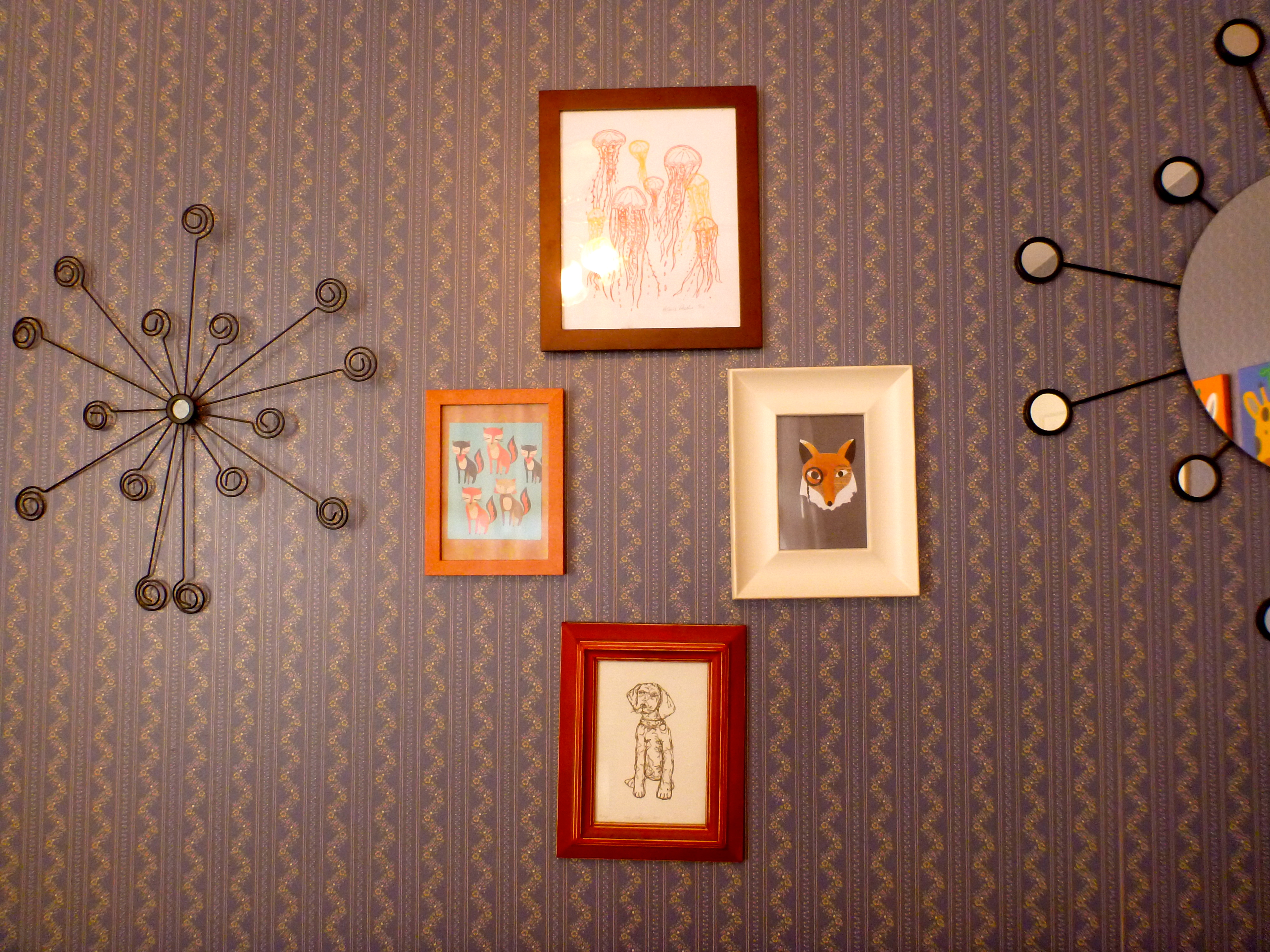 And for Christmas, my dad made these four paintings to go on the wall: I think the animals are super cute, and he did a great job choosing colors that go with the other things in the room.