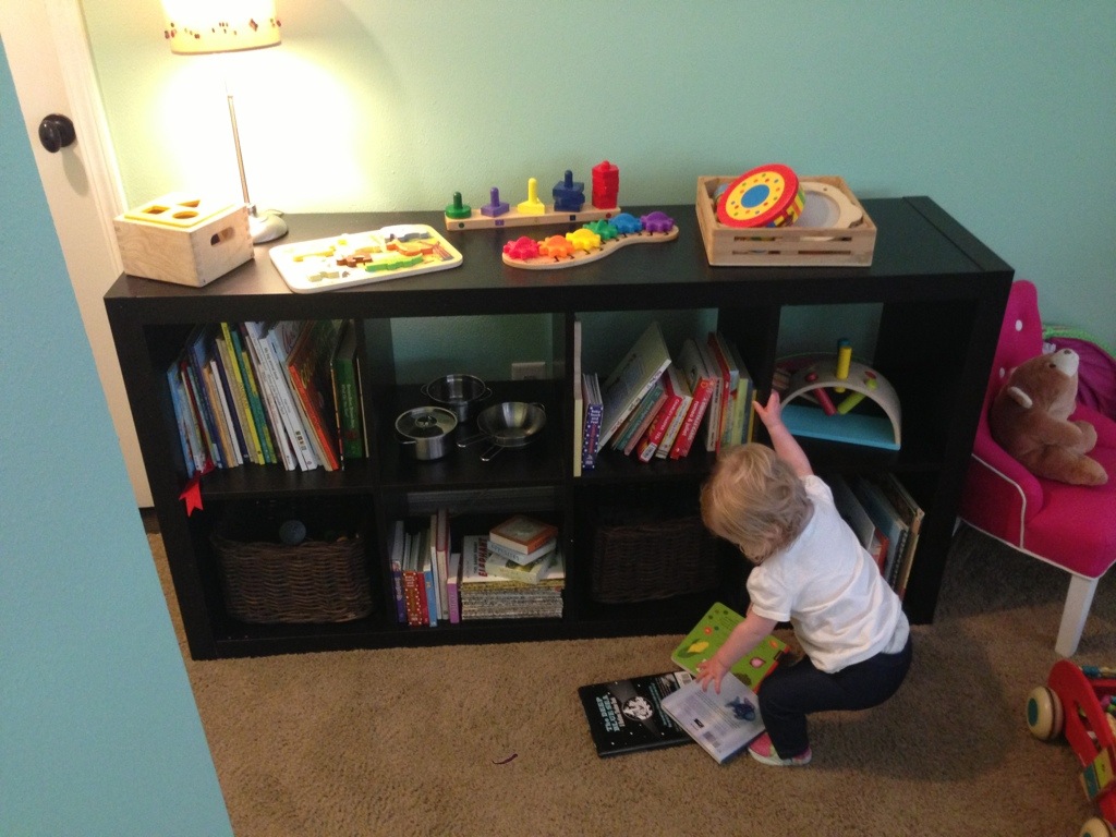 Etta and Claire have two main play spaces, their room and our den. In each space, it was important to me that the toys be arranged where they could get them out themselves (and eventually, put them up themselves), and to have things displayed and accessible rather than buried in a bin under a million other things. Things they can see actually get used, whereas things in a giant pile get forgotten.