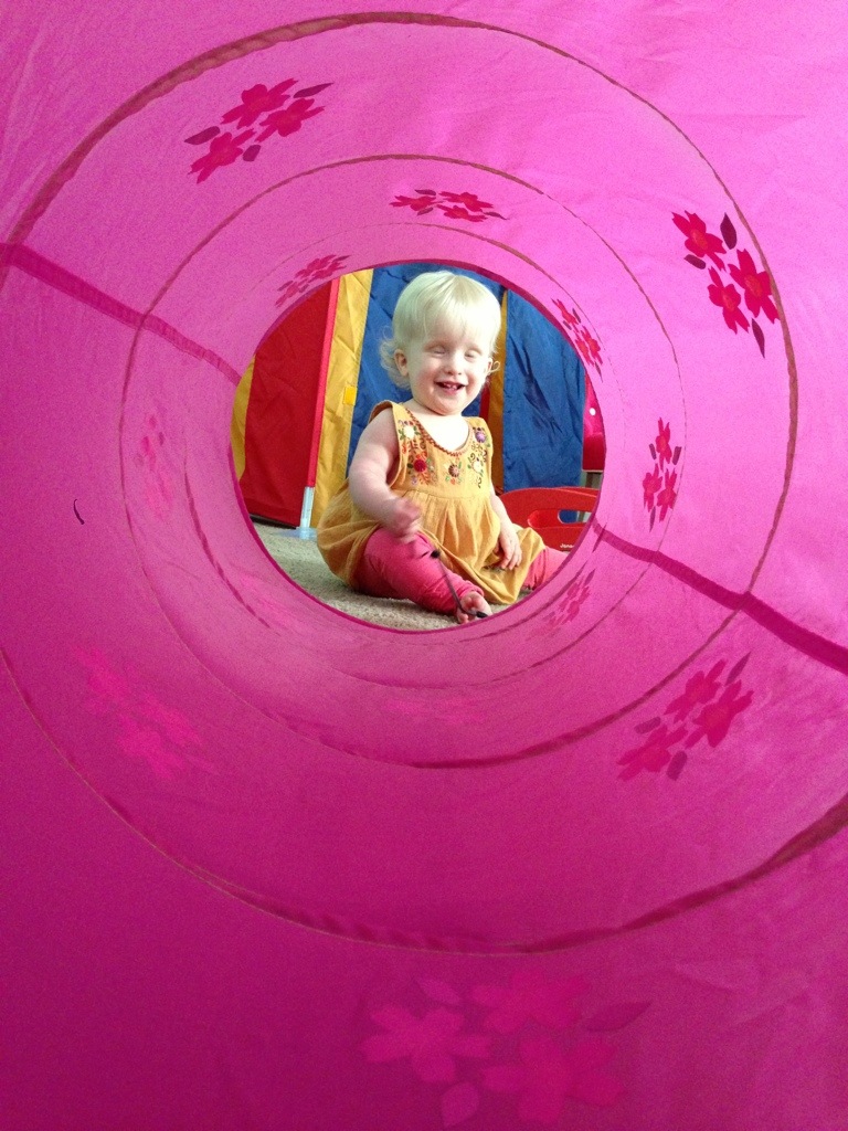 I really love these alphabet blocks from Janod.The Janod walker wagon in action. As you can see, it can support Claire’s weight, and even without anything in it, is super stable for kids just starting to walk, not prone to tipping.We’re big fans of this collapsible tunnel, a gift, which folds nicely when we’re not playing with it.Here the girls are playing with our one and only noisy toy, the flowers, which are Lamaze brand. You can see the Hape shape sorter and some Melissa and Doug food. Our Ikea baby gym, now useful as an object to pull up on, is in the background.Little Wheely Bug in action, with a push from sister.A rare exception to my no-plastic rule: this Little Tykes rocking horse. It’s perfect for little toddlers because it’s low enough that they can get on and off themselves, and the seat has a back, which keeps them on it. And I think it’s not bad looking.